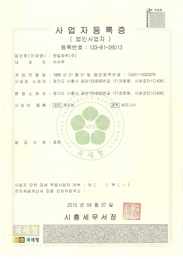 한일화학㈜ 경기도 시흥시 공단1대로 80번길 17(정왕동, 시화공단 1다 408호) 대표번호 : 031-498-3161 이메일: khbae@hanilchem.kr 팩스번호: 031-498-3160