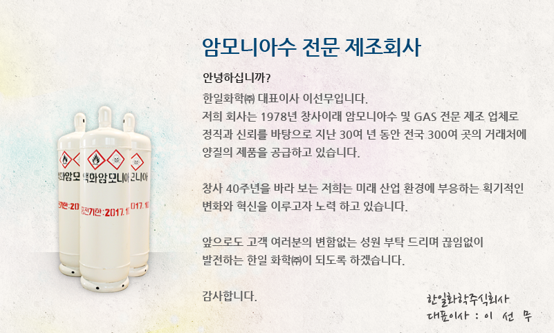 한일화학㈜ 경기도 시흥시 공단1대로 80번길 17(정왕동, 시화공단 1다 408호) 대표번호 : 031-498-3161 이메일: khbae@hanilchem.kr 팩스번호: 031-498-3160 Copyrights(c) 2015 (주)한일화학 All Rights Reserved